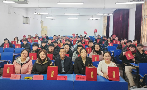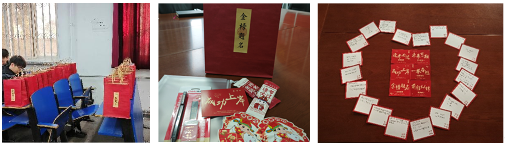 宣誓后,在场老师为同学们分发了精心准备的考研礼包。一套文具,寓意笔下生花;一个拉边袋祝同学们在考场上如有神助、自如发挥,朝着梦想大步迈进;一张贺卡,写满了学院老师和学弟学妹的祝福,承载着学院的期望与祝愿;4颗糖,考研路充满荆棘,为学子送来满满的爱;最后,祝愿所有学子金榜题名,一战成硕。