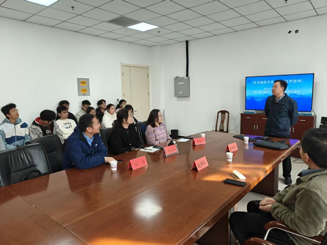 2025 年 11 月 12 日,山东省地矿局第二水文地质队(以下简称 “山东地矿二水”)人事科科长朱智勇、党委委员及总工程师赵季初一行到访水韵职梦职业生涯咨询室,以“校友搭桥、校企联动”为纽带,开展拓岗合作交流暨校园招聘宣讲活动。咨询室成员张丽娜、陈康、姜晓雪及全体毕业学子参与活动,双方围绕岗位拓展、人才共育、就业对接等核心议题深入洽谈,为校企合作与毕业生就业搭建坚实桥梁。