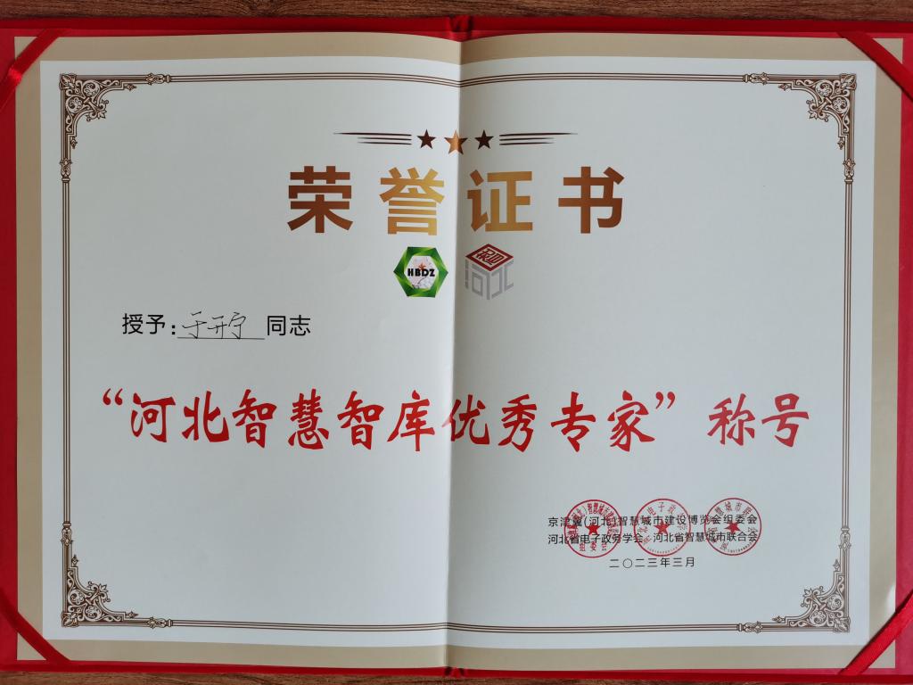 院长于开宁教授荣获“河北智慧智库优秀专家”称号并上台领奖,青年教师鹿帅副教授参加大会。