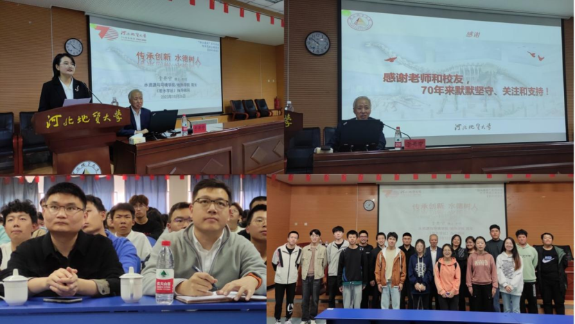 (左上武强院士和志强校长会面;右上郝爱兵祝福母校;左下若水学社参会师生合影;右下参会院士大师校友合影)