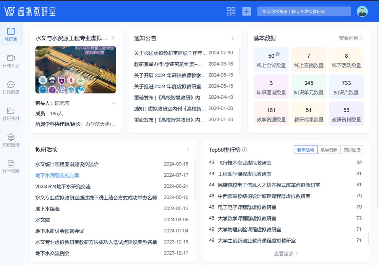 由河海大学牵头,联合武汉大学、南京大学、四川大学、吉林大学、中国地质大学(武汉)、内蒙古农业大学、西安理工大学、华北水利水电大学等高校共同发起的水文与水资源工程专业虚拟教研室,已于2022年入选教育部第二批虚拟教研室建设试点名单。目前,该教研室涵盖清华大学等47所高校及4个行业企业单位。通过不断扩展成员结构,定期或不定期开展学术交流与研讨,教研室依据新工科及产出导向(OBE)理念,推动产学研协同育人,围绕一流专业建设与复合型国际化创新人才的培养,探索并创新“智能+”时代的新型基层教学组织运行模式,形成适合不同专业背景的“智慧+新工科”水文人才培养新模式。此外,虚拟教研室共建共享在线开放课程、新形态教材等优质教学资源库,打造水文专业师资培训平台,培育具有国际影响力的教学团队,全面提升人才培养质量。