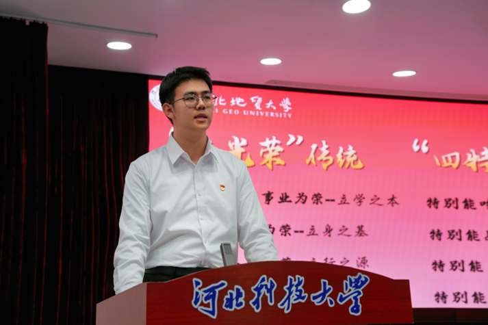 讲台上他“从达观博物,到实干担当”为主题,结合自身成长经历,从专业学习、科研创新、社会实践等方面分享经验,讲述了自己在参加科研活动时老师诲人不倦的指导,以及自己在面对困难时如何应对。通过真实感人事迹,生动的生活故事和深刻的心灵感悟,展现了新时代青年积极向上,勇于担当的精神风貌。