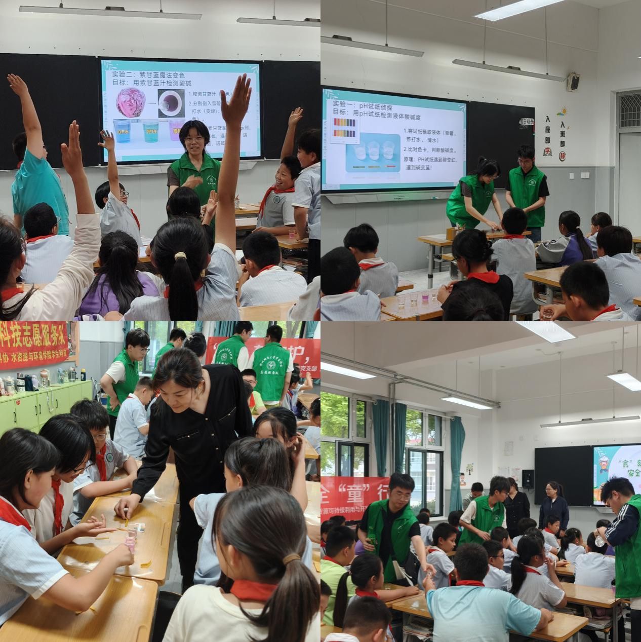 在“酸碱变色”科学实验环节,孩子们在志愿者的悉心指导下,化身小小科学家,用 pH 试纸检测雪碧等常见饮品的酸碱度,观察紫甘蓝汁滴入不同液体后的神奇颜色变化。志愿者巧妙地将实验现象与食品添加剂对人体酸碱平衡的影响相结合,引导孩子们深入思考,极大地激发了他们对食品安全知识的探究兴趣。随后的互动问答环节更是将现场气氛推向高潮,孩子们热情高涨,纷纷举手抢答,现场笑声与抢答声交织,热闹非凡。志愿者为答对的小朋友送上文具等实用奖品,让食品安全知识随着这份惊喜,悄然融入孩子们的日常生活。