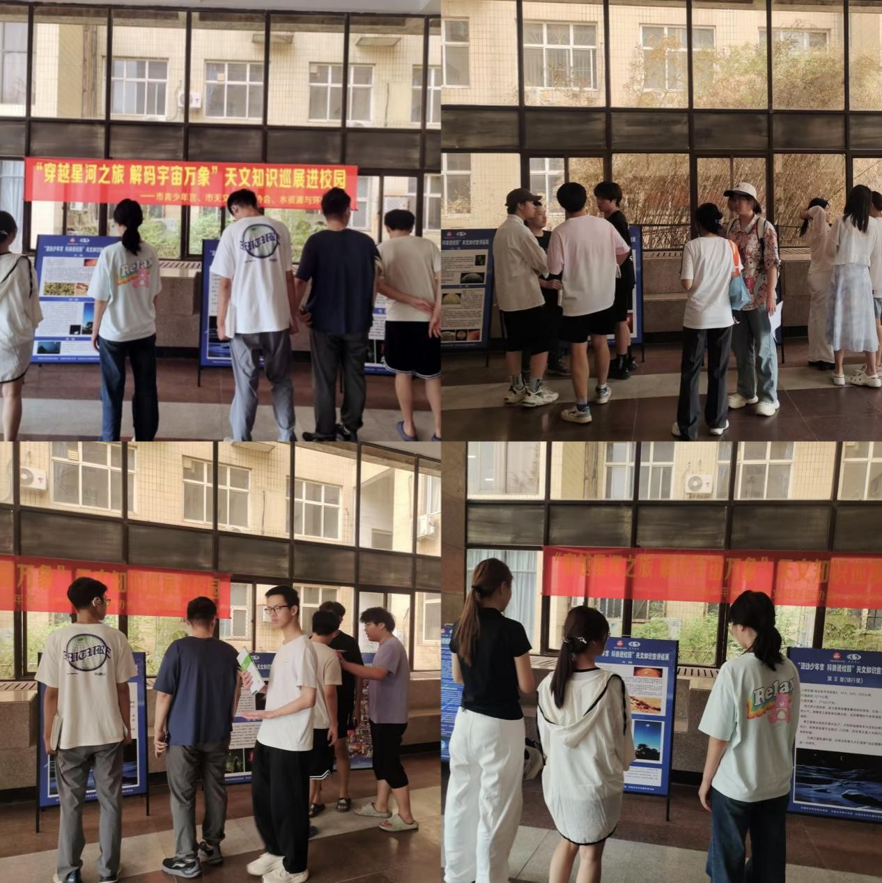 精心策划,在主楼大厅布置了内容丰富、图文并茂的天文知识展牌。全方位、多层次地为同学们呈现了天文学的壮丽景观。课余时间,学生们纷至沓来,驻足观展,沉浸在天文知识的海洋中。这一过程不仅有效培养了学生的科学探索精神与创新意识,更为他们在知识的宇宙中探索前行提供了有力的助力。