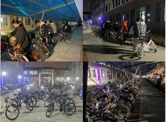 自行车整治区域同样高效推进。针对部分区域车辆乱停乱放、占用人行通道等问题,志愿者们迅速行动:先将散落、倾倒的自行车逐一搬运至指定停放区,再严格按照“朝向统一、间距均等”的标准,逐辆调整排列。整齐划一的车阵不仅让校园空间更显整洁,也为师生出行营造了便利环境。