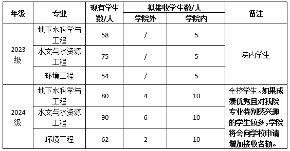 地下水科学与工程专业、水文与水资源工程专业、环境工程专业拟接收转入学生51人,具体各专业分配情况见表1。
