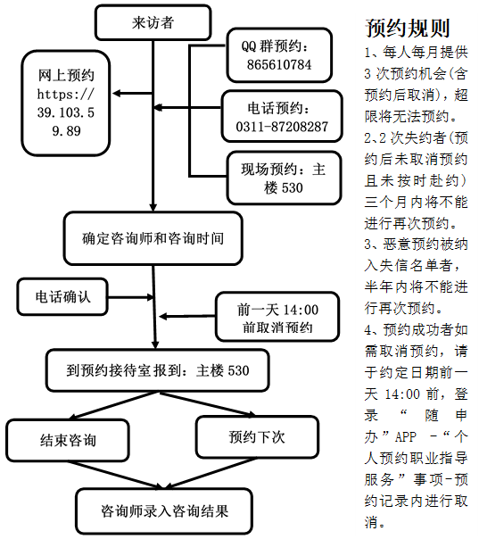 更值得关注的是,咨询室专属线上预约系统(//39.103.59.89)已正式启用,结合电话预约渠道,构建起 “双轨并行” 的便捷预约体系。线上预约系统内详细列明了咨询室的核心服务内容,涵盖职业方向定位、简历优化技巧、面试实战攻略、就业政策解读等多个重点领域。