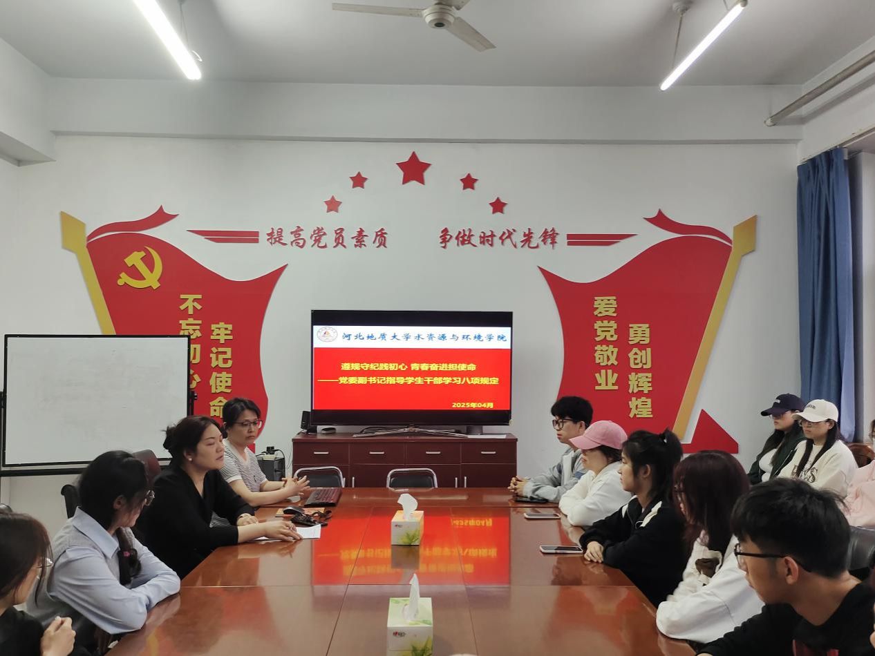 在主楼542会议室组织召开了一场主题为“遵规守纪践初心,青春奋进担使命”的学生干部中央八项规定精神学习会议。本次会议由学院党委副书记张丽娜主持,辅导员王美云老师出席,水环学院团委、学生会、科协全体学生干部参会。
