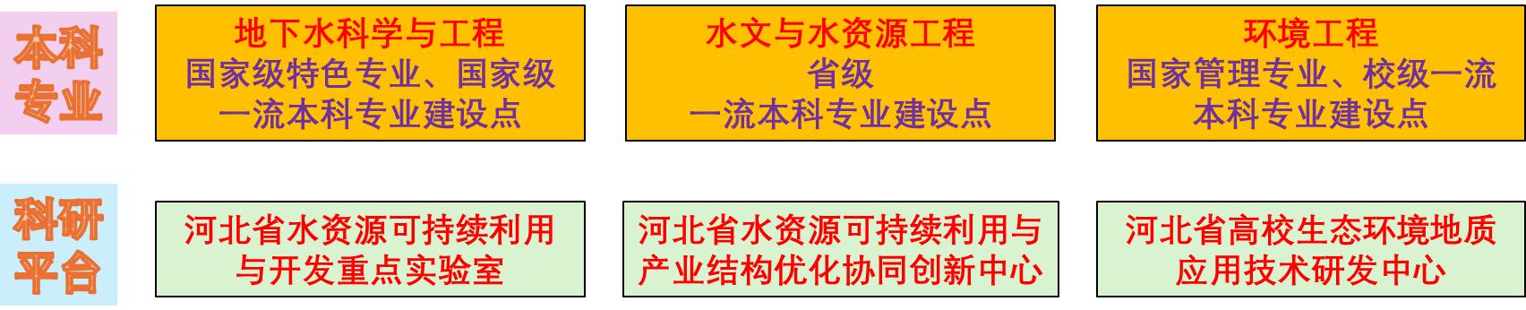 学院拥有地下水科学与工程(国家级特色专业、国家级一流本科专业建设点)、水文与水资源工程(省级一流本科专业)、环境工程(国家管理专业、省级一流本科专业建设点)三个本科专业,专业入选“双万计划”达到100%,3门课程入选国家级一流本科课程。拥有河北省重点学科“水文学及水资源”,河北省高等学校本科教育创新高地“水利水电教育创新高地”,河北省高等学校实验教学示范中心“水资源环境实验教学中心”,河北省高等学校品牌特色专业“地下水科学与工程专业”以及“水文与水资源工程专业”,河北省示范性专业学位研究生培养实践基地“地质工程专业领域”,河北省水资源可持续利用与开发重点实验室、河北省水资源可持续利用与产业结构优化协同创新中心、河北省高校生态环境地质应用技术研发中心、河北省地下水系统新污染物行为与效应重点实验室等教学及科研平台。