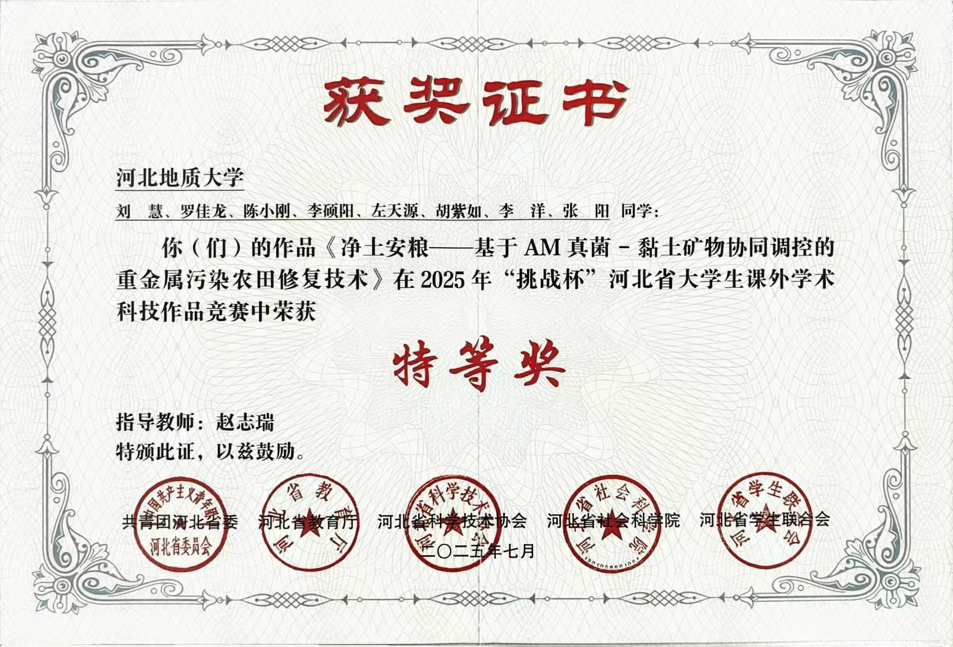 刘慧及其团队凭借《净土安粮—基于AM真菌-黏土矿物协同调控的重金属污染农田修复技术》这一创新课题,在2025年“挑战杯”比赛中脱颖而出,荣获河北省科技发明制作类特等奖。该项目聚焦重金属污染农田的生态修复问题,通过微生物与黏土矿物协同调控作用,为耕地保护与粮食安全提供了一条绿色、经济、可持续的新路径。