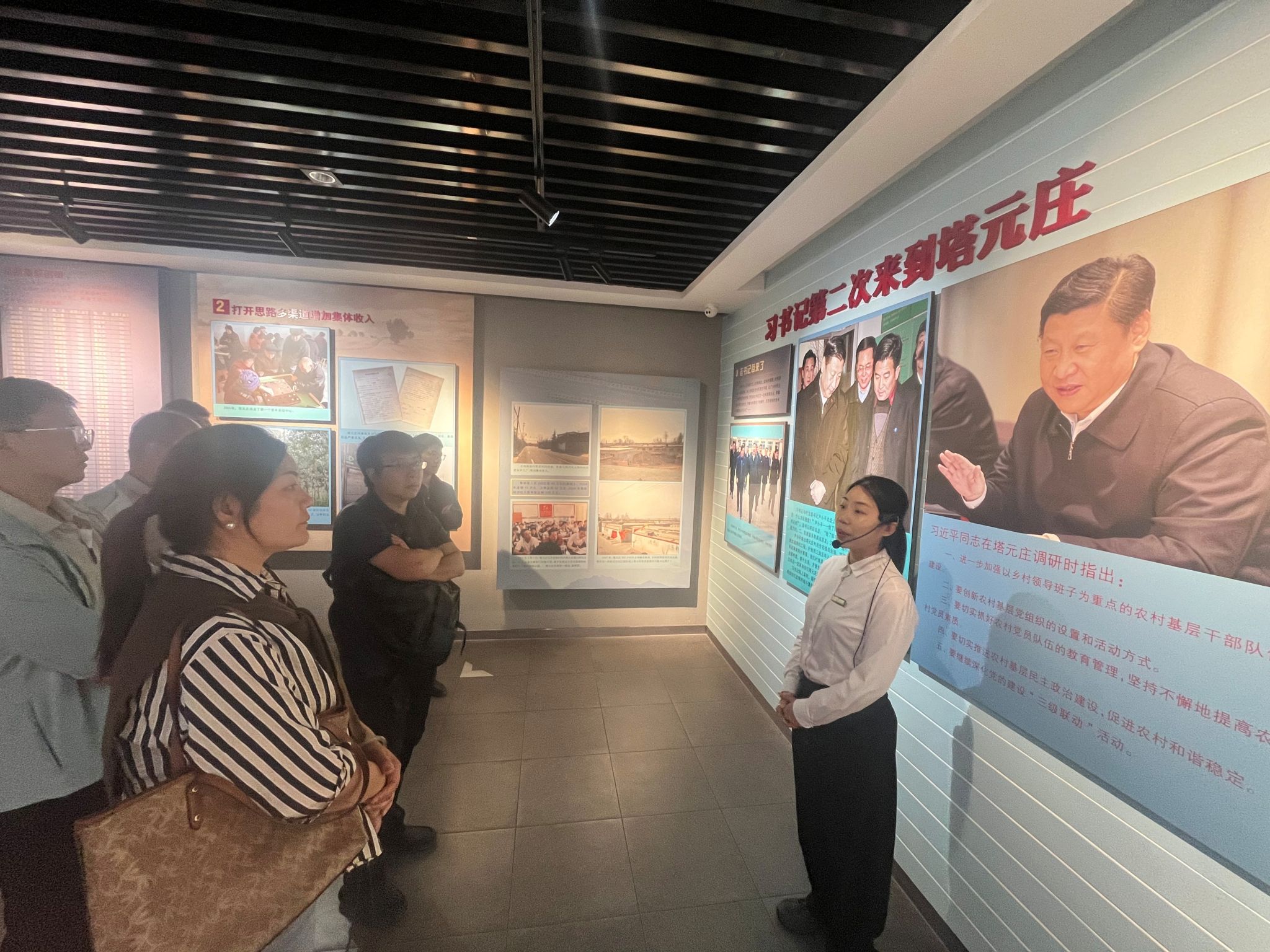 在专业讲解员的引导下,师生们先后走进塔元庄村史馆与同福园示范园区,沿着红色足迹感悟乡村振兴的 “塔元庄实践”。在村史馆内,通过珍贵的历史照片、实物陈列与影像资料,师生们系统学习了塔元庄从“贫困村落”到“小康示范村”的蝶变历程,重点回顾了习近平总书记莅临考察时对乡村发展的殷切嘱托 ——“创新农村基层党组织的设置和活动方式”“切实推进农村基层民主政治建设”,深刻理解了“党建强则乡村兴”的核心逻辑。